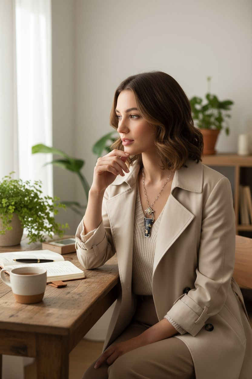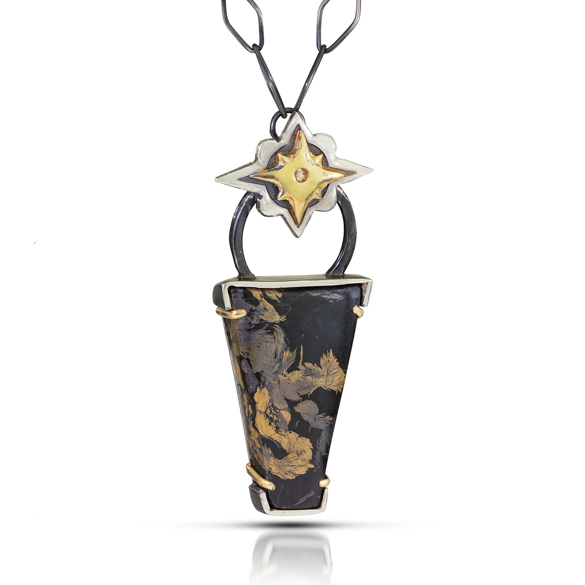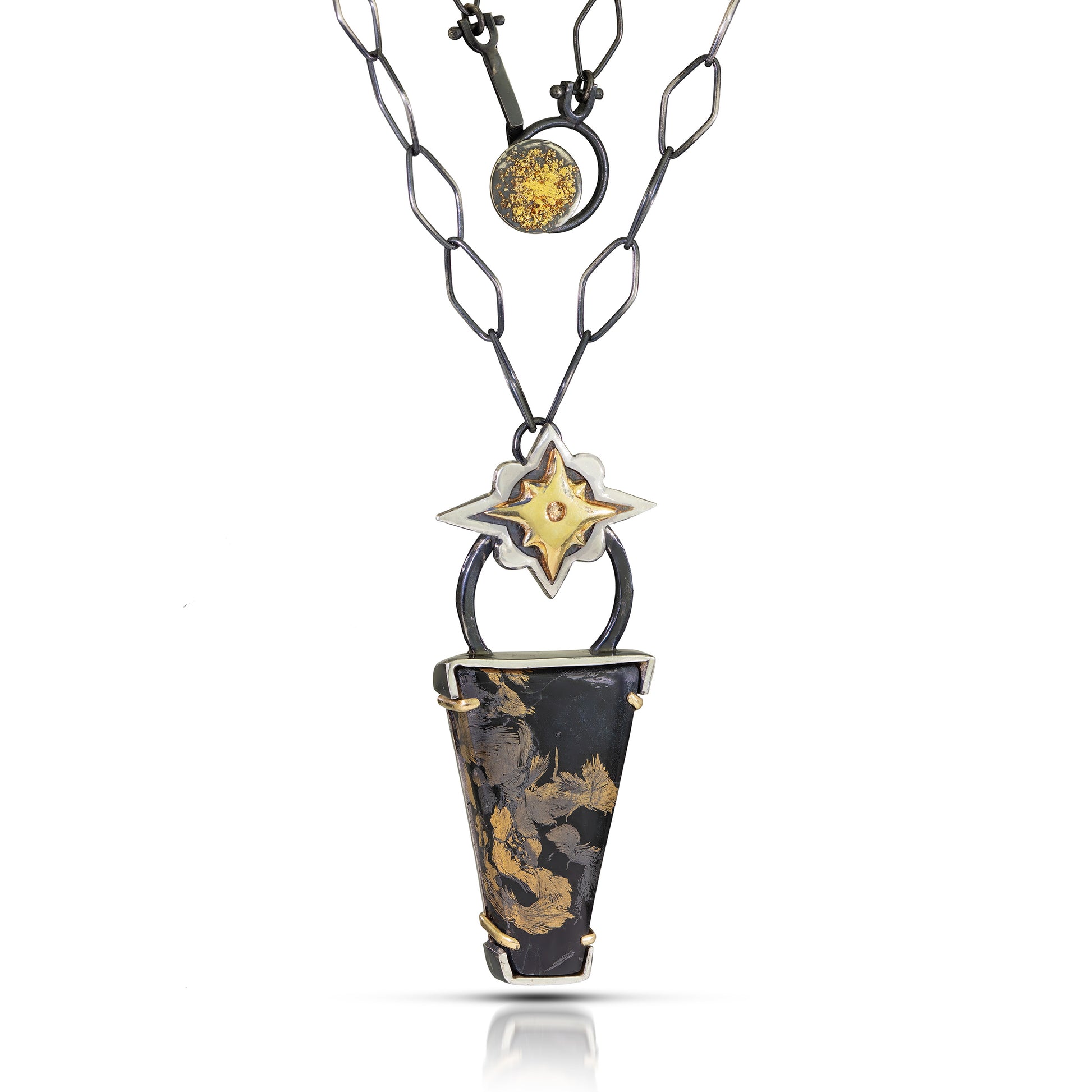 Chain: Integrated 22 inch oxidized sterling silver chain with custom clasp featuring 18k gold accents