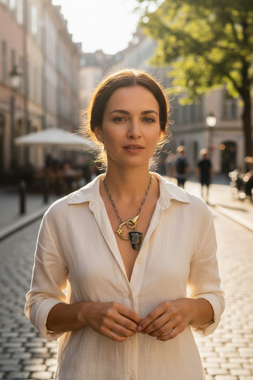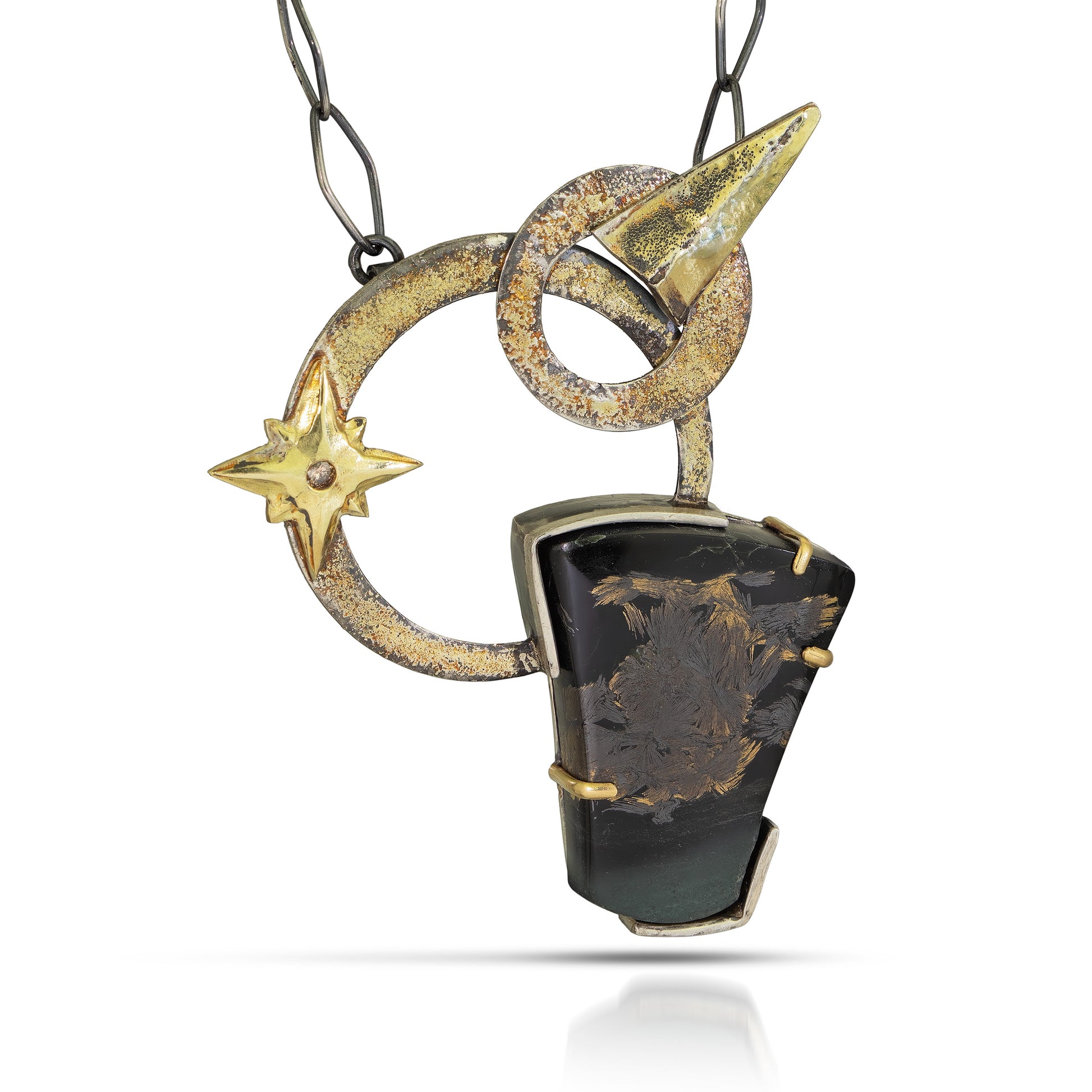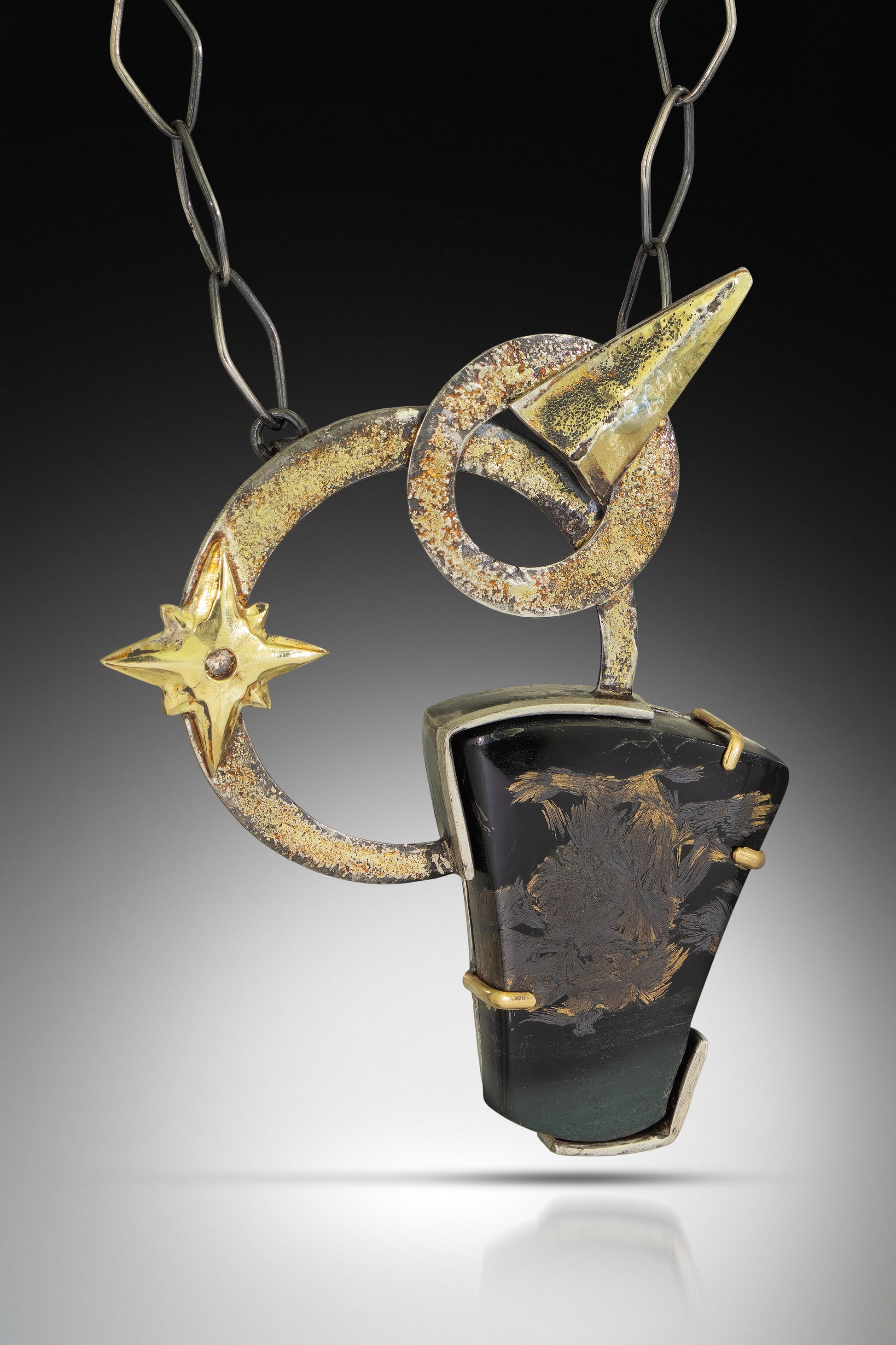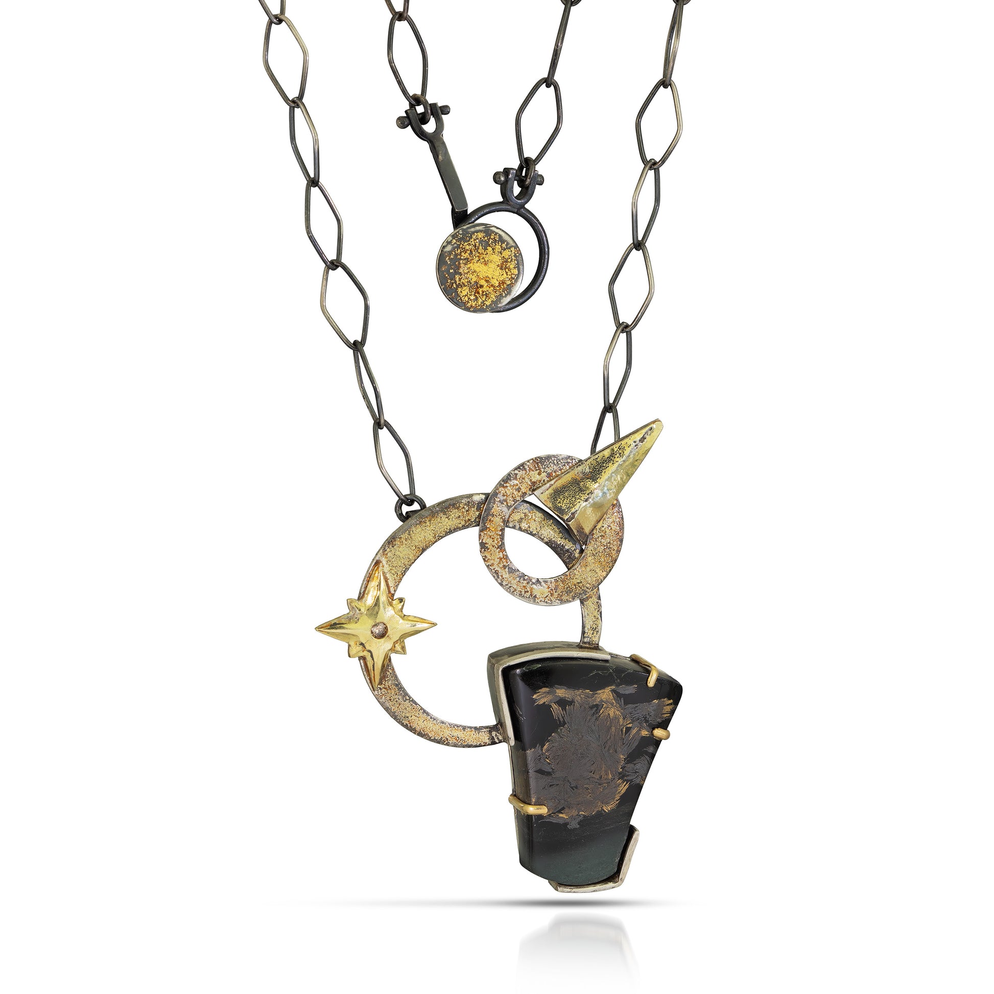 Chain: Integrated 22 inch oxidized sterling silver chain with custom clasp featuring 18k gold accents